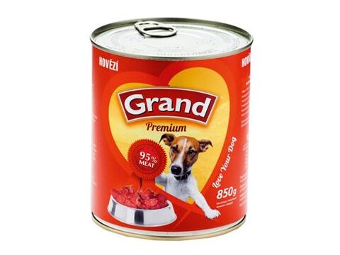 Konzerva GRAND konz. pes hovězí je kompletní krmivo pro psy, vytvořeno z čerstvého masa (min. 60 %) bez chemických přísad. Neobsahuje žádné chemické a konzervační přísady ani sóju. Obsahuje podíl vitaminů a aminokyselin v přírodní nepozměněné formě. Do konzerv je přidávána rýžová mouka v maximální míře 0–2 % z důvodu zahuštění masové složky.